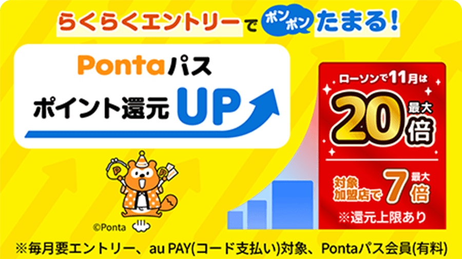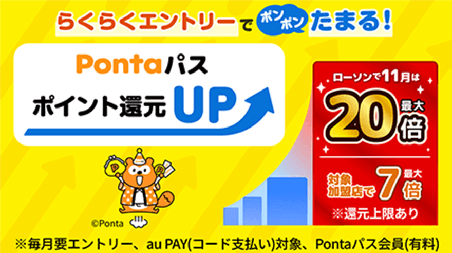 ローソンでau PAY(コード支払い)を使用しお買い物をすると通常最大14倍Pontaポイント還元のところ、期間中は最大20倍まで還元率がアップ。