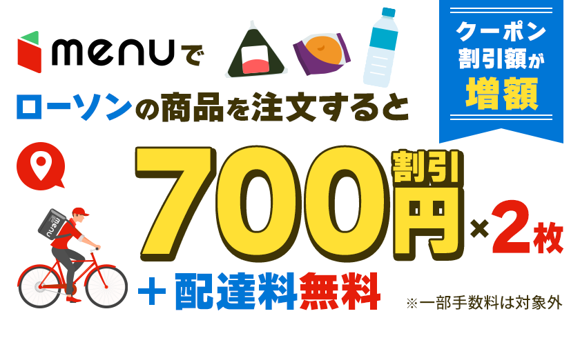 • ・配布するクーポンはローソンの実店舗ではご利用いただけません。デリバリーサービス「menu」専用のクーポンとなります。
