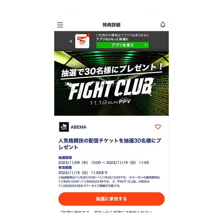 「FIGHT CLUB」のPPV視聴チケット(税込4,800円)を、auスマートパスプレミアム(有料)の会員限定で抽選で30名様にプレゼントいたします。
